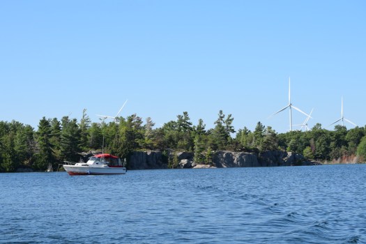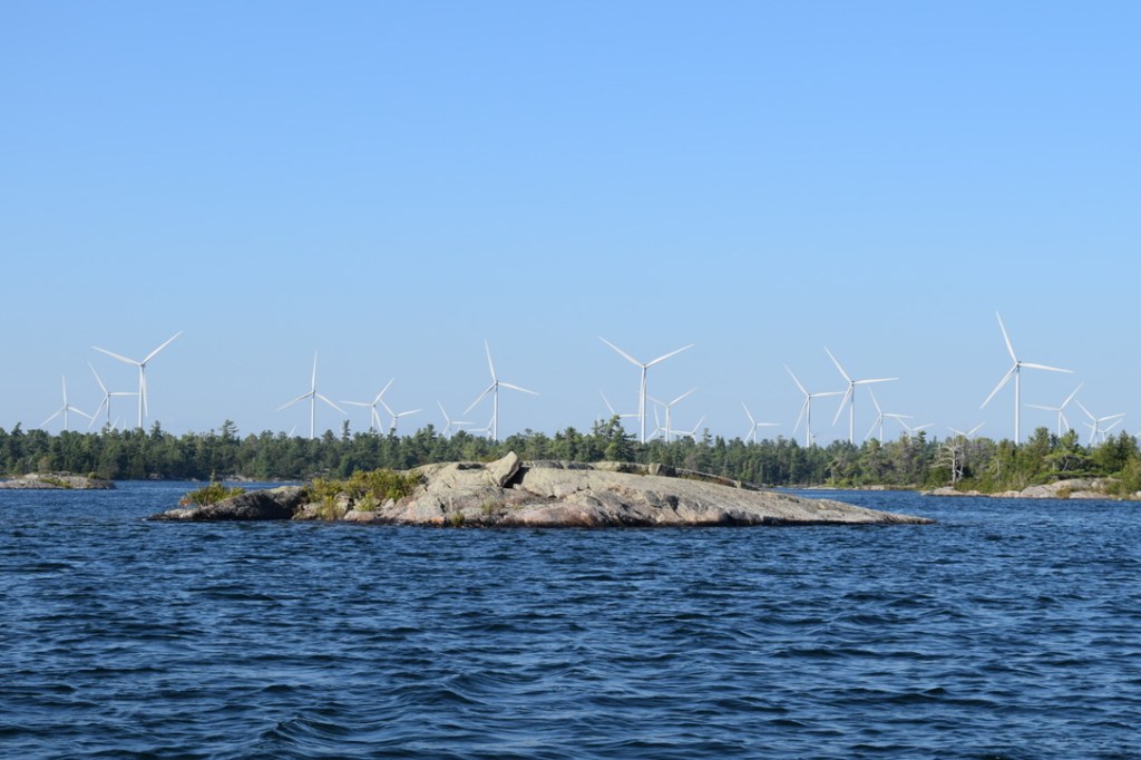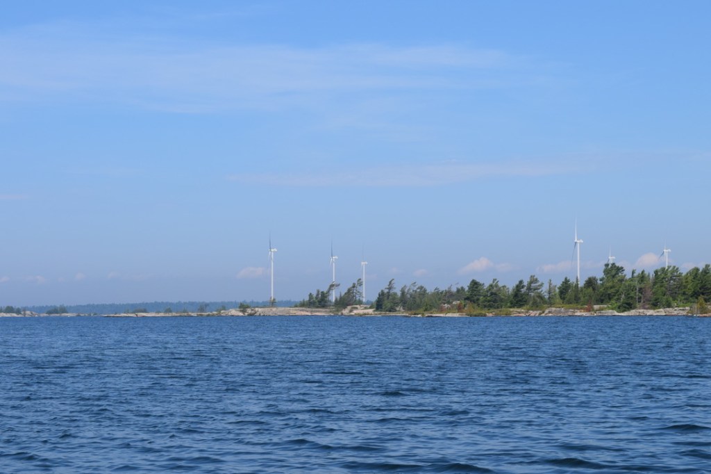 There were two big changes from the last visit. Water levels were at a record high, about four feet above chart datum. Getting into Black Bay off the small craft route at Cunningham’s Channel requires local knowledge and a sharp eye for shoals in water that is a bit opaque from tannin. With that much extra water, shoals that normally are two feet down are six feet down and well out of range of our prop. On the other hand, low rocky islets are the “new” shoals, and the general lay of the land becomes hard to recognize. The other big change, which I’ll get to, is the wind turbines of Henvey Inlet.