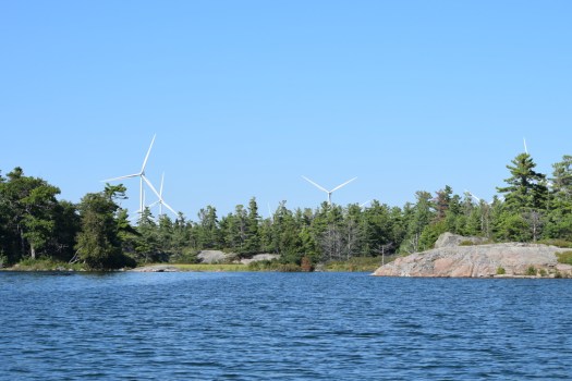 As for the wind turbines: the Henvey Inlet First Nation wind farm is impressively large. When I started running north offshore, coming out of Pointe au Baril, the forest of white turbine towers and blades started emerging on the horizon. I wasn’t sure how I was going to find the experience of them. Back in 2009, I drove through the Maple Ridge wind farm in upstate New York. About 200 turbines have been erected in the rolling countryside of Lewis County, and having all those rotating things, wherever you looked, was a bit unsettling to me. The Henvey farm is smaller in terms of the number of turbines, 87, but these are much bigger turbines: 3.45-mW Vesta V136s, versus the 1.65-mW Vesta V82s at Maple Ridge. (The model number refers to the turbine blade diameter, in meters.)
