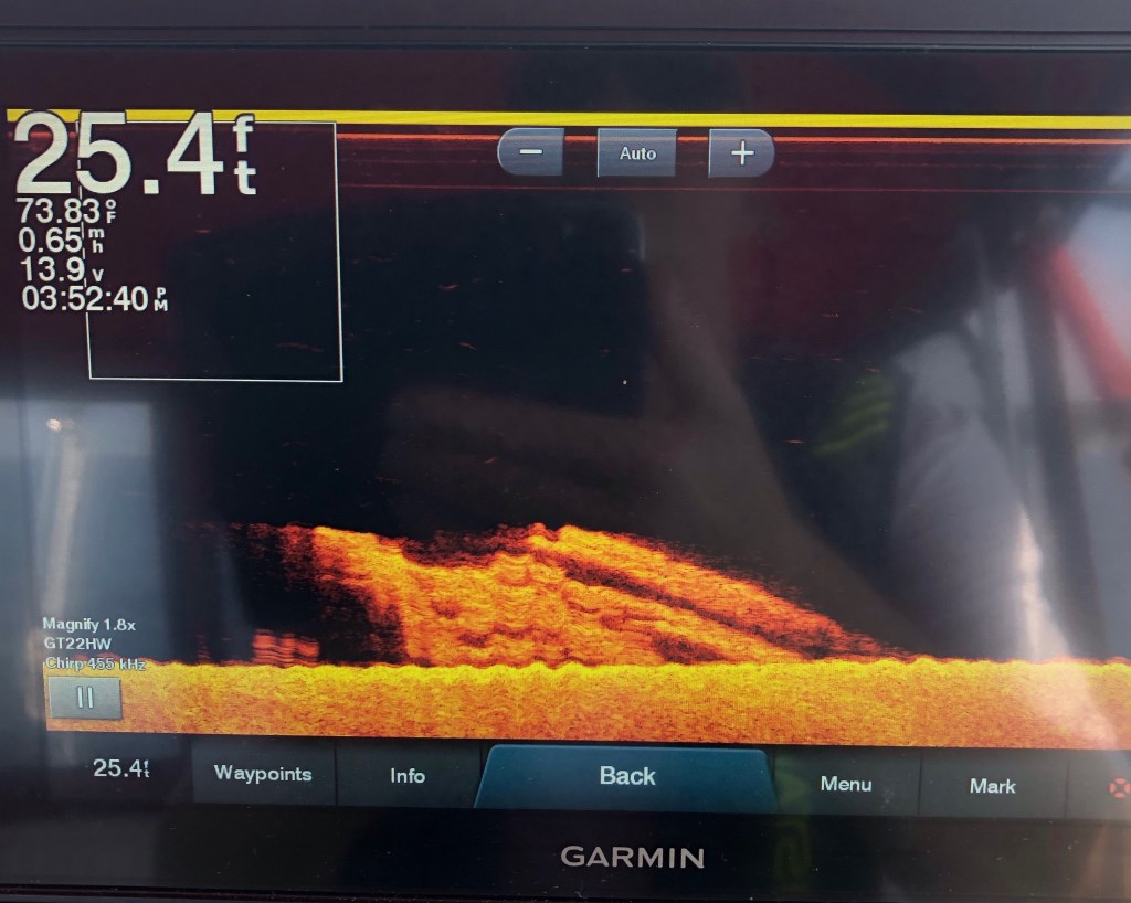 It took me four tries, but today I’m fairly sure I found the wreck of the Wawinet, an 87-foot motor vessel that sank in September 1942 with a loss of 25 lives. The wreck is known to some divers, but its location to my knowledge has never been revealed. A Navionics user gave a location for the wreck that I spent way too much time trying to confirm with my boat’s hi-res sonar, and today I finally expanded the search area and hit a target of the right heft in the right depth of water (20-25 feet), and in a logical place, about a quarter-mile from the Navionics position. The sonar image is a little wavy because of chop on the surface as I was making scanning runs. More on this find in due time.