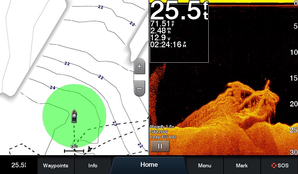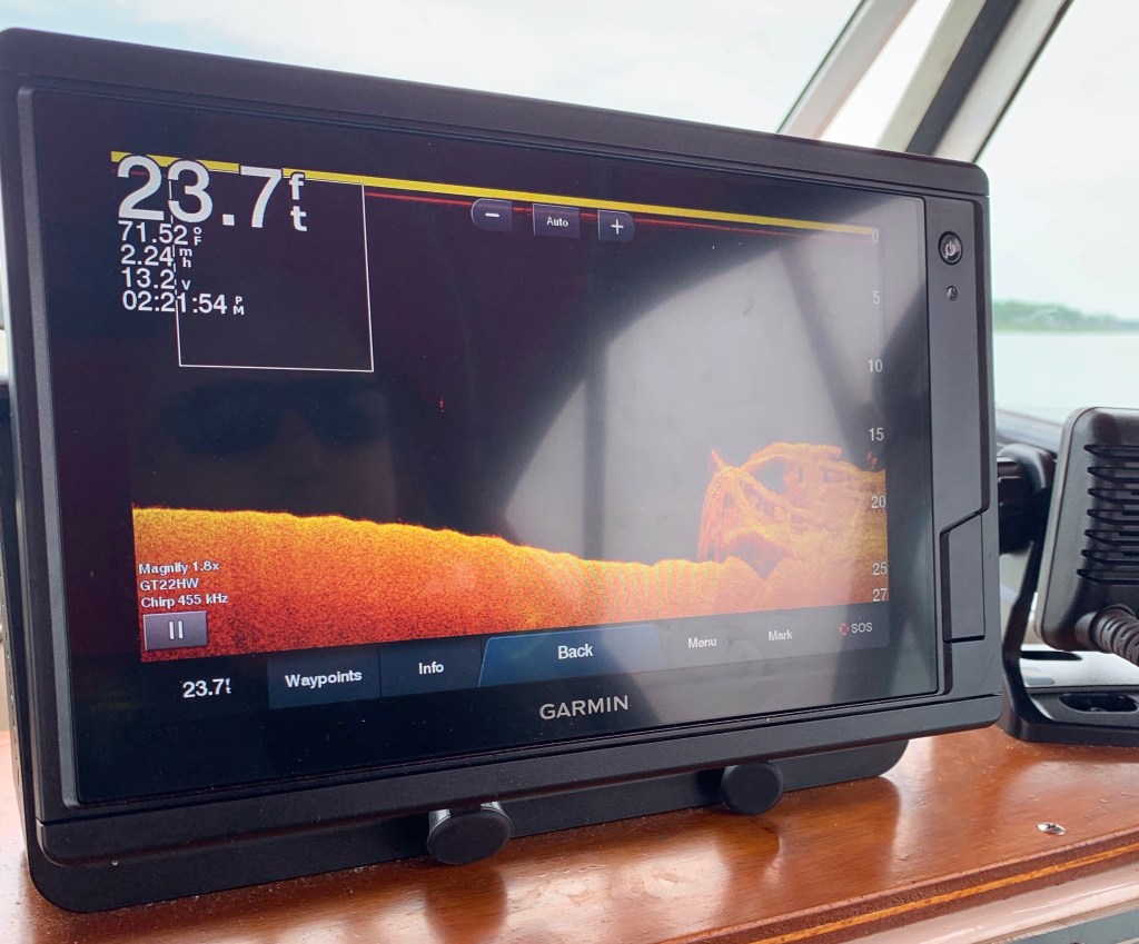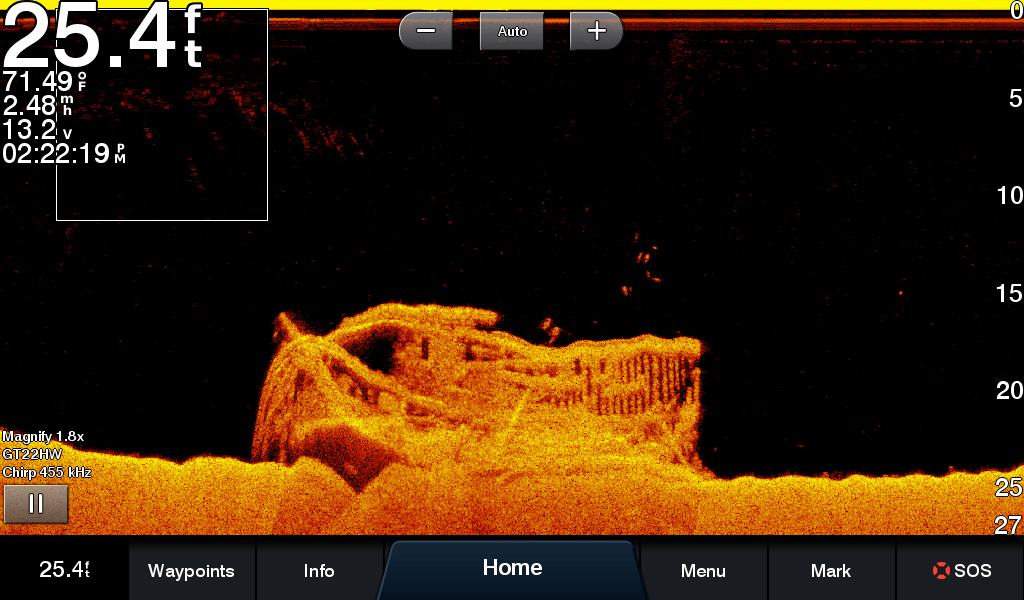 I was back today in the vicinity of where I located the Wawinet on Wednesday. The water was surprisingly calm for a Saturday, with minimal boat wake, so I made a couple fresh sonar runs and came up with better images than on the initial day. High-frequency CHIRP sonar can produce remarkably photograph-like imagery. What little waviness appears in these images is due to the boat bobbing in a bit of chop. I have zero doubt that this is the Wawinet, which as I explained in the last post was an 87-foot propellor-driven vessel owned by former NHL player Bert Corbeau. She sank in September 1942 after touching the nearby bank at the south end of Beausoleil Island on a night cruise. Twenty-five of forty-two people aboard were lost, including Corbeau.