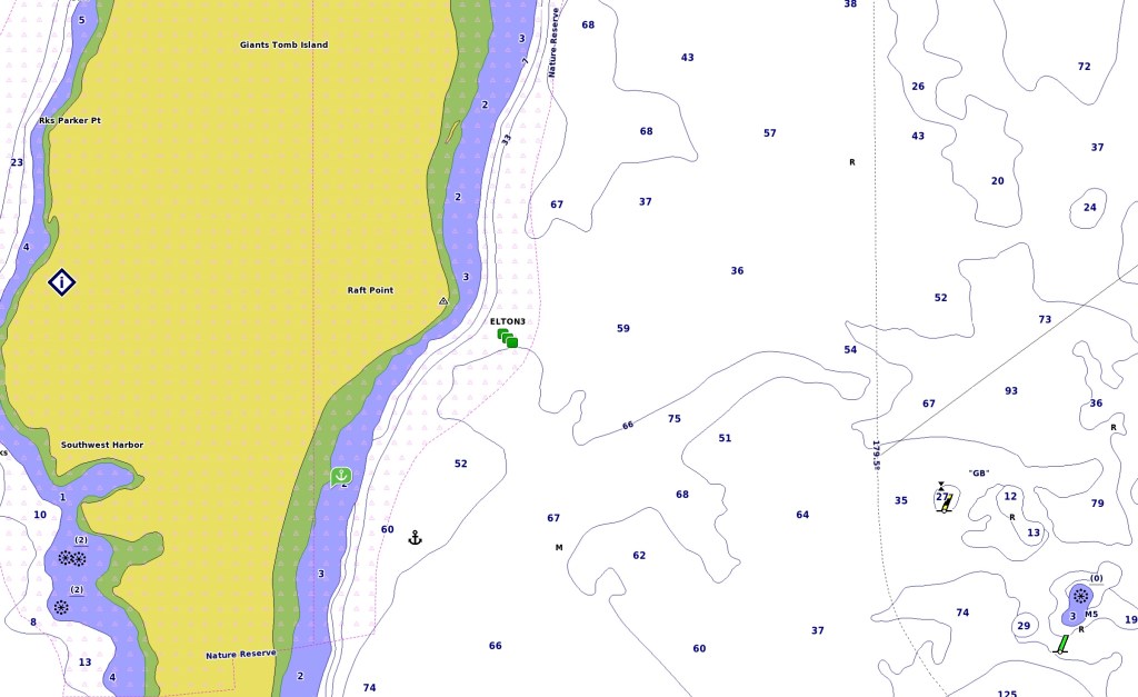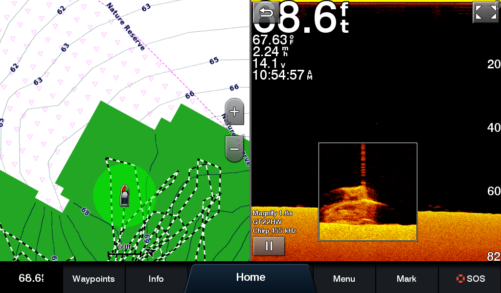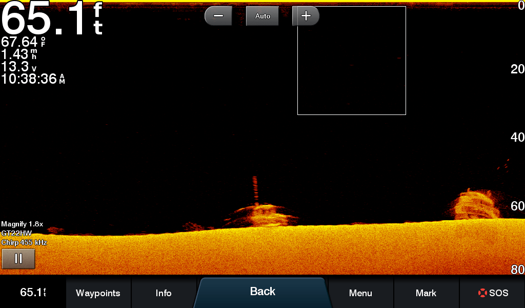 I made a run this morning to the east side of Giant’s Tomb Island, about 12.5 miles from home, to check out two wrecks for a friend, Dallis Favret, who is a sailor and a diver. Dallis had a lat/lon position, but hadn’t dived them yet and didn’t know if the position was accurate. It turned out the position was dead-on between the two wrecks, which I’m told are roped together.