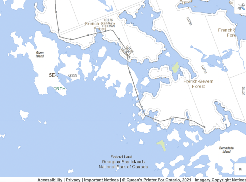 While noodling around in Maps on a new Mac Air, I was puzzled to find a fairly substantial lump of park identified east of Gunn Island and north of Bernadette Island, with no explanatory label. There are two small island holdings of Georgian Bay Islands National Park in that area, as can be seen by the small blotches of green on the Ontario Crown Land Use Policy Atlas, but nothing there that aligns with what was on the Apple system’s map.