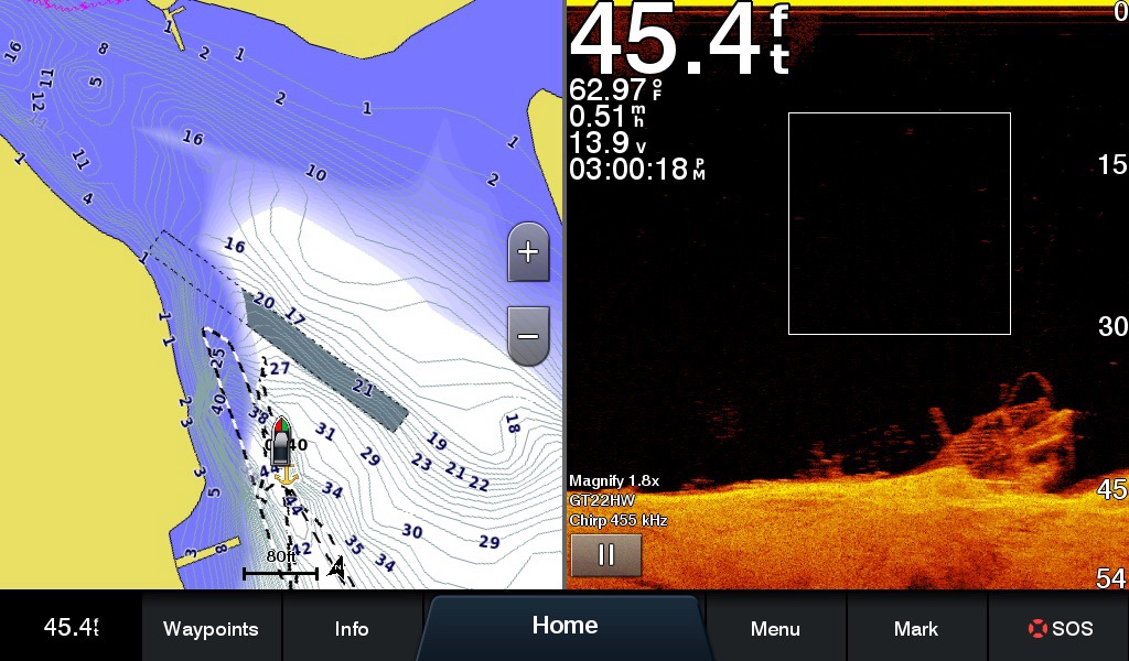 Some divers told me about a wreck at the mouth of the Musquash River, in the back corner of the Cognashene. I tried finding it earlier this summer but came up blank—surprising for such a narrow area of searching and good instructions on where to look. I had another try yesterday and found it. A diver who visited it twenty years ago tells me it is supposed to be a Down East style vessel that was stripped before being deliberately scuttled.