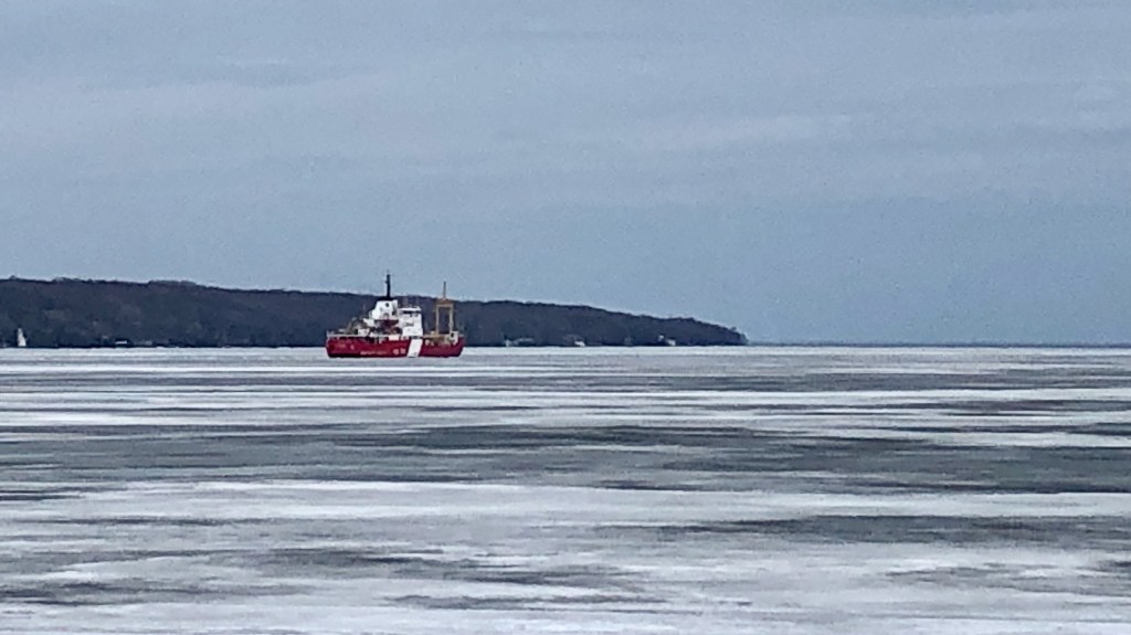 The Canadian Coast Guard icebreaker Griffon was in Midland today, carving out an escape route for the bulk carrier Whitefish Bay, which has been in port all winter, and helping spring breakup along. The Griffon seems to have decided to spend the night here with us in Severn Sound.