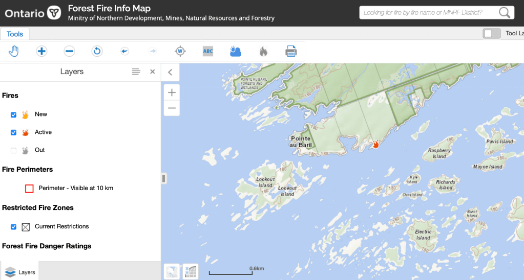 The second fire is a 2.6-ha wildfire burning right at the shore at Pointe au Baril, near Pelham Cove. The blaze is reportedly under control. UPDATE (May 14): the fire is now out.