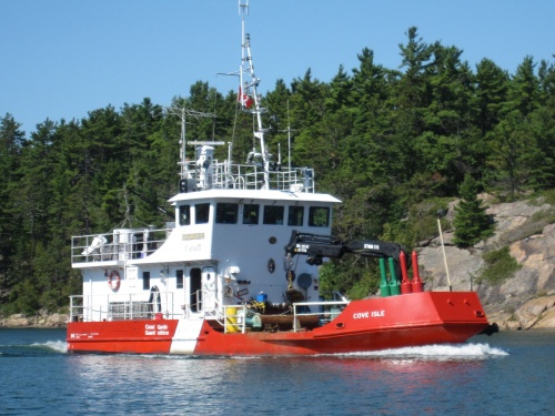 As I reported on May 7, quite a few navaids on eastern Georgian Bay have been reported missing, damaged, or out of position on the NAVWARNs system. The Coast Guard usually aims to have the navaids back in order by the Victoria Day (May 2-4) weekend, but this year the fix-it list plainly has been more than it can handle. The navaids tender Cove Isle was in and around Midland for a few days, and as of about 13 hours ago (the most recent position I have for her on my AIS app MarineTraffic) she was steaming north, up the small craft route, and was approaching O’Donnell Point. The navaid problems south of that position have been cleaned up, according to the latest NAVWARNs email bulletin, but there’s a lot of work still to be done to the north. You can check the current problems on the NAVWARNs website.