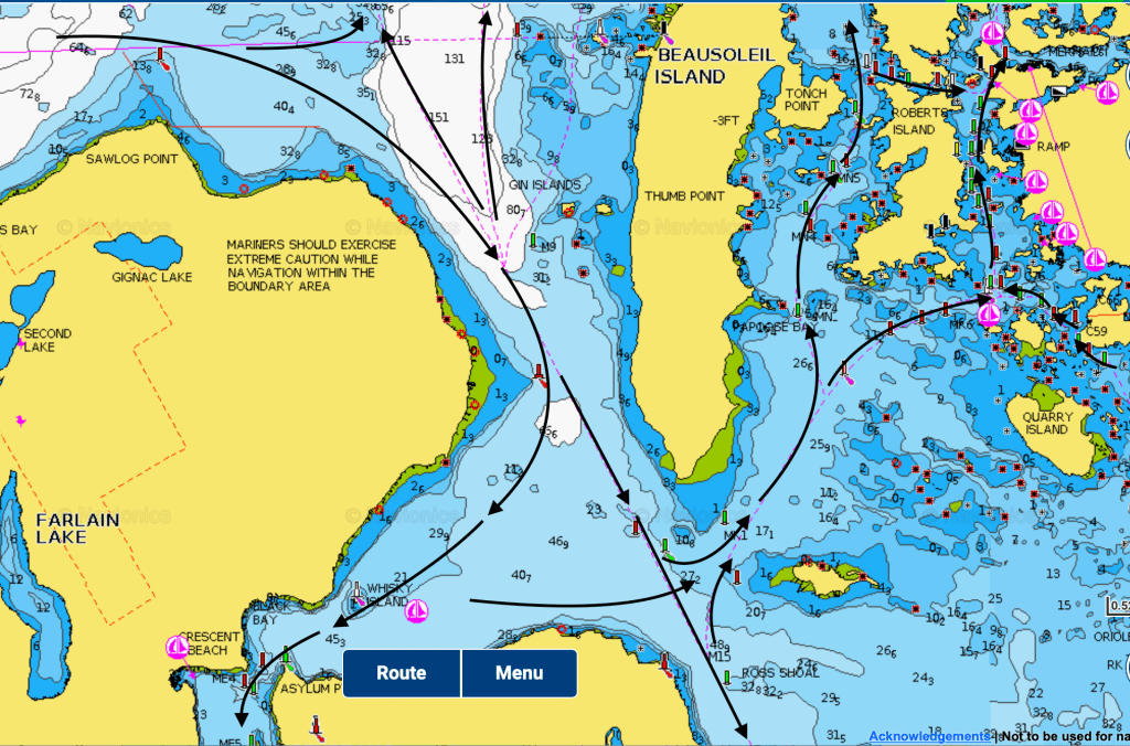 The waters around the Gin Rocks are a transition point for vessels accessing the small-craft route. The green navaid (M9) off the Gin Rocks follows the southbound = inbound = upstream logic of arriving vessels, but it’s also here that northbound vessels accessing several options on the small craft route start thinking northbound = upstream. The real excitement is in the waters around Candlemas Shoal, at the south end of Beausoleil Island. There is a pair of navaids (M14, red, and M13, green) on the shoal’s west side, and the southbound = inbound = upstream logic applies. (There’s actually a lot of water immediately around them, just as there is around M9, and unless you’re a freighter, messing up here isn’t likely to ruin your day, so long as you stay away from Candlemas.) Just to their east is another navaid, MK1 (green), which is meant to keep you clear of Candlemas and the associated shallows off Beausoleil Island. (MK1 happens to be close to the wreck of the Wawinet, which I have written about in the blog. This motor vessel went down in 1942 with a loss of about two-dozen lives, and I am sure touched the shallows, which form a prominent bank, before heeling over, flooding, and going down.) If you follow the arrows, you can see the logic of how the southbound = upstream passage bends around the bottom of Beausoleil Island to become the northbound = upstream passage of the small craft route. The logic however isn’t necessarily clear to everyone, and I have seen at least one keelboat go aground here.