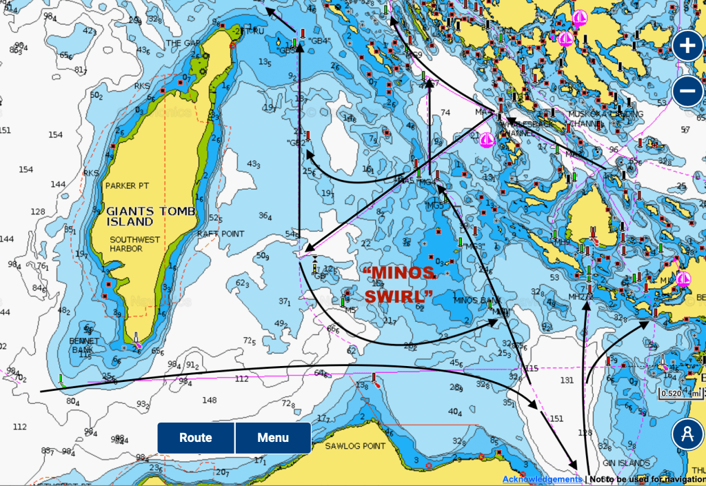 I’ve provided here two main views of the local red-right-returning paths. The first, focussed on the outer approaches, shows the basic freighter rule in play, of the inbound route that passes south of Giant’s Tomb Island and to the north of Sawlog Point on the mainland being upstream. Running counter to this orientation is the plethora of small-craft routes, all headed more or less north. In the middle of it all is a southwestward-running cross channel that runs from Whaleback Channel into the waters on the east side of Giant’s Tomb. This cross channel, which proceeds upstream to the southwest, gives you the option of then following two different courses, both upstream. One heads north to pass the north tip of Giant’s Tomb. The other turns south to create what I’ll call the “Minos Swirl,” a kind of back-eddy of counter-clockwise upstream motion. The important thing to remember hereabouts, when heading north, is that if you choose to follow the small-craft route on the east side of the Minos Bank, you’re going upstream, but if you decide instead to go west of the Minos Bank, the short, critical run towards M5 at Indian Belle Rock is downstream, and you don’t want to pass it on the wrong side.