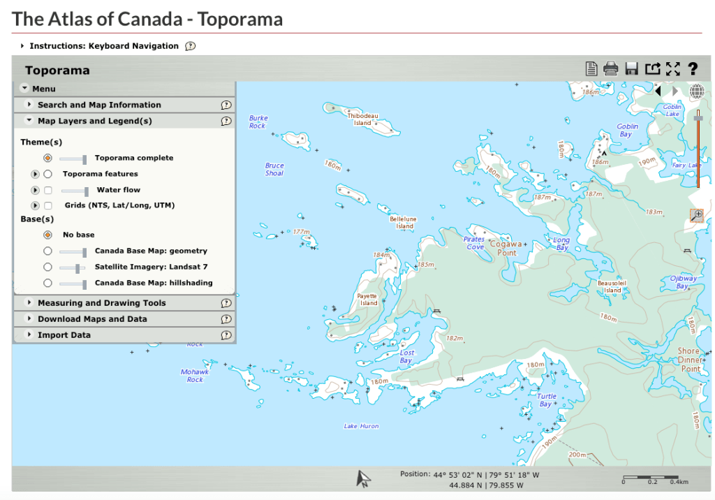 I used to advise investing in paper topographic maps for cruising areas. These don’t show land use or ownership (beyond park locations and boundaries), but they do include building structures. But the information can be out of date. There’s also Toporama at The Atlas of Canada, maintained online by Natural Resources Canada. You can zoom in on any location in Canada and print the results. You can also generate maps at Ontario’s Ministry of Environment and Energy. Comparing the two tools for northern Beausoleil Island shows their relative strengths and weaknesses. Toporama gives you helpful stuff like structures, while Ontario’s tool shows trails on Beausoleil Island.