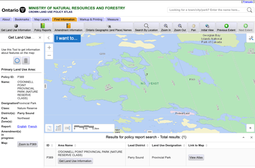 Provincial Crown land is subject to a variety of permitted uses. The best resource for eastern Georgian Bay and the North Channel is online at Ontario’s Crown Land Use Policy Atlas. The map is scalable and very detailed, but I recommend de-selecting “private land” (under Crown Land Use Data) because for some reason that layer sometimes obscures park areas. If you click on the “find information” tab and choose “get land use information,” clicking on the map on a location that interests you will call up the relevant info. (The interface can be sticky. It’s sometimes easier to key in the policy ID label on the map, for example, P369 to learn more about the lands in O’Donnell Point Provincial Park.) It will tell you if it’s private land, for example. If it’s some kind of public land, it will provide a link to a detailed report, in French or English, with guidance on where to find permitted uses.