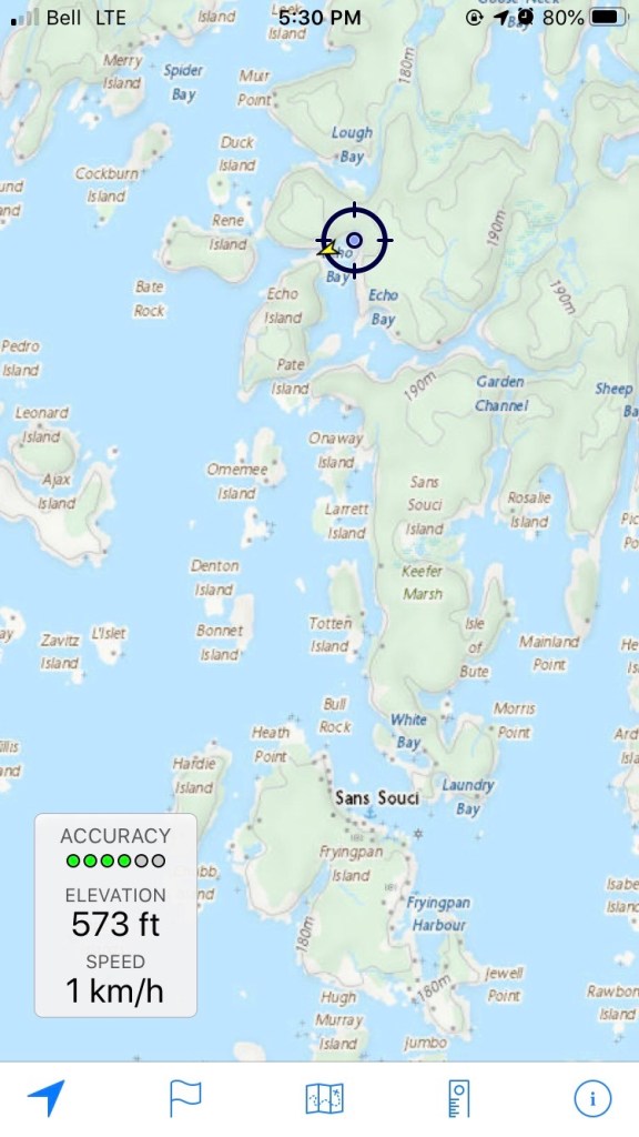 A great (free!) app is Topo Maps Canada, which I run on my iPhone. Available from the App Store, this amazing tool from developer David Crawshay (whose LinkedIn profile says is a senior software architect at Halliburton in Houston) uses official 1:50,000 topographic maps in several options that you can download at no charge. (There’s also a free Topo Maps US version.) In addition to displaying your position using your phone’s GPS, the app allows you to create and save trails by “painting” your movement, measure distances, and see your elevation changes as you move through the countryside. A great tool for when you’re hiking ashore.
