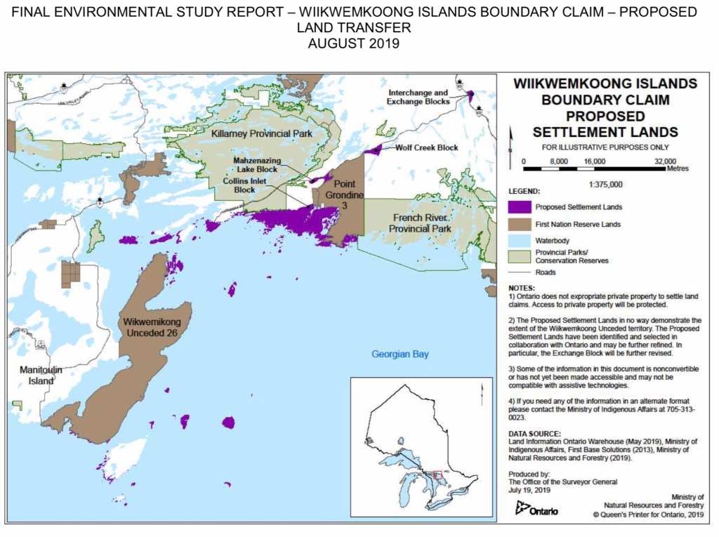 One of the largest reserves encountered by cruisers is Reserve 2 of Henvey Inlet First Nation, which stretches south along the east shore of Georgian Bay from the Key River to just north of Britt, and includes such cruising grounds as Henvey Inlet, Sandy Bay, and part of Black Bay. It’s important to realize that while the mainland in this area is part of the reserve, the islands are not. They’re either private property or provincial Crown land, as the case may be. There is an outstanding land claim, submitted in 1997, by the Wiikwemkoong Unceded Territory, for islands along the North Channel from just east of Sault Ste. Marie, all the way down the eastern shore of Georgian Bay to O’Donnell Point. A 2019 proposed settlement involves a number of islands in Georgian Bay close to the unceded reserve’s current lands on eastern Manitoulin Island and Point Grondine, as well as Philip Edward Island and some nearby lands (see the map). Cottagers around Collins Inlet, which is on the main block of the proposed settlement lands at Philip Edwards Island (but which does not involve any transfer of cottage properties), are vigorously opposed. As well, Wasauksing First Nation has been negotiating with the province since 1981 for the title to several islands adjacent to the reserve on Parry Island, near Parry Sound. Resolution of the claim requires Canada and the First Nation to initial and sign a Boundary Clarification Agreement.